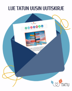 Käy lukemassa TATUn vuoden 2023 ensimmäinen uutiskirje. Pysyt ajantasalla TATUn ajankohtaisista asioista ja näet, mitä kaikkea mielenkiintoista TATUn toimintaan sisältää. Uutiskirjeeseen pääset klikkaamalla tästä. Haluatko uutiskirjeen suoraan sähköpostiisi? Ilmoittaudu TATUn postituslistalle. Saat kuusi kertaa vuodessa tietoa TATUn toiminnasta, pääset lukemaan mielenkiintoisia artikkeleita sekä ensimmäisten joukossa saada tietoosi tulevat tapahtumat, kuten kurssit ja vertaistapahtumat.