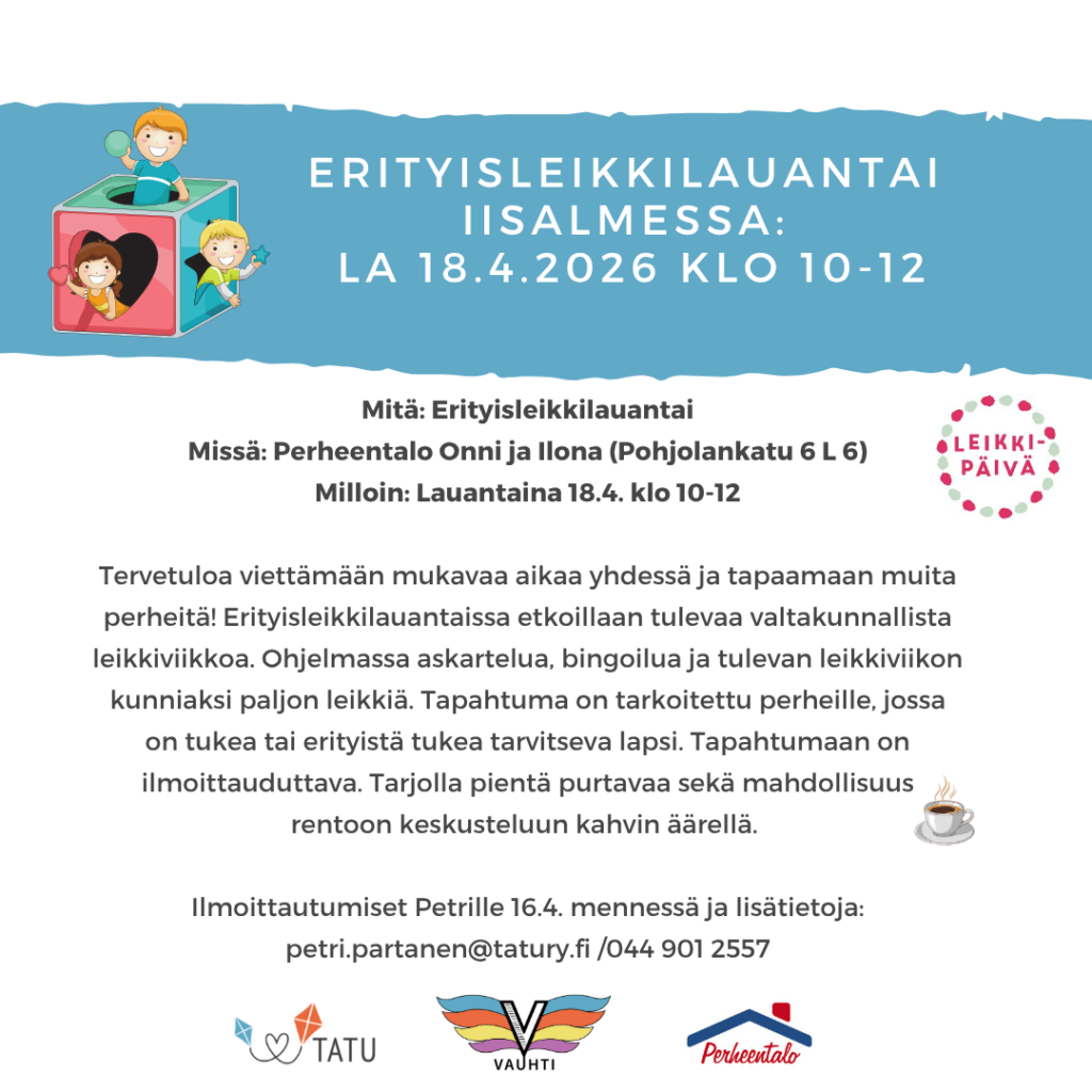 Tervetuloa viettämään mukavaa aikaa yhdessä ja tapaamaan muita perheitä! Erityisleikkilauantaissa etkoillaan tulevaa valtakunnallista leikkiviikkoa. Ohjelmassa askartelua, bingoilua ja tulevan leikkiviikon kunniaksi paljon leikkiä. Tapahtuma on tarkoitettu perheille, jossa on tukea tai erityistä tukea tarvitseva lapsi. Tapahtumaan on ilmoittauduttava. Tarjolla pientä purtavaa sekä mahdollisuus rentoon keskusteluun kahvin äärellä.