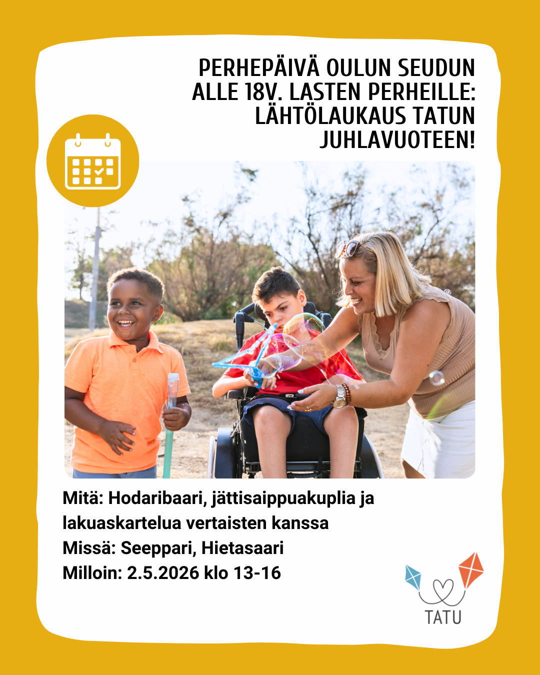Oulun seudun alle 18v. lasten ja nuorten perheiden vertaistapaaminen: juhlitaan yhdessä 25v. TATUa!