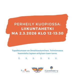 Tapahtuma on tarkoitettu perheille, jossa on tukea tai erityistä tukea tarvitseva lapsi. Tällä kerralla mukana Vammaisperheyhdistys Jaatinen. Ohjelmassa mukavaa yhteistä tekemistä koko perheen kanssa. Tervetuloa viettämään aikaa yhdessä ja tapaamaan muita lapsiperheitä! Tapahtumassa tarjolla pizzaa klo 11.30. Ilmoittautuminen ja erityisruokavaliot 28.1.2026 mennessä Petrille: petri.partanen@tatury.fi /0449012557 Tapahtuman järjestää yhteistyössä TATU ry:n VAUHTI!-toiminta ja Perheentalo Onni ja […]