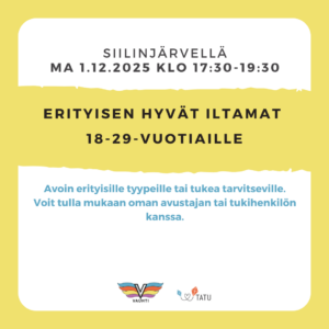 Toimintaa erityislapsiperheille: Tervetuloa Kaikkien Aikojen Pikkujouluihin! Mitä: Kaikkien Aikojen PikkujoulutMissä: Varkauden Perheentalo (Kauppakatu 32)Milloin: Keskiviikkona 17.12.2025 klo 16:00-18:00 Tapahtuma on avoin kaikille lapsiperheille, jossa on huomioitu erityisen tuen tarve. Tapahtumaan ei tarvitse ilmoittautua. Voit halutessasi ottaa mukaan tonttulakin! Lisätietoja: petri.partanen@tatury.fi tai p. 044 901 2557 Tapahtuman järjestää TATU ry:n VAUHTI!-toiminta ja Varkauden Perheentalo – Lapsen […]